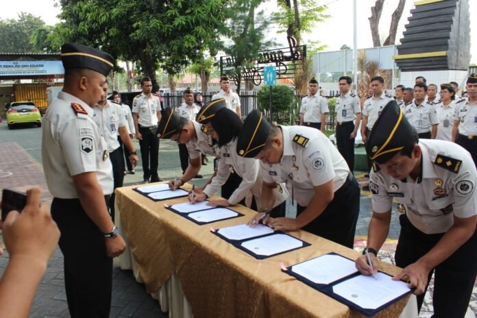 Kegiatan yang berlangsung di lapangan apel Lapas Kelas IIA Sidoarjo tersebut diikuti oleh seluruh jajaran pejabat struktural dan pegawai sebagai bentuk komitmen bersama dalam mewujudkan kinerja yang profesional, akuntabel, serta berorientasi pada pelayanan publik yang semakin berkualitas.