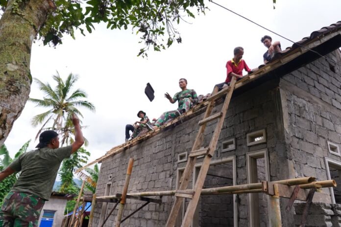 Radarnews9.com || Blitar – Anggota Satgas TMMD Ke-127 Kodim 0808/Blitar bersama warga bahu-membahu memasang genteng/atap dalam program renovasi Rumah Tidak Layak Huni (RTLH) milik Mbah Ayem di Dusun Krisik, Desa Krisik, Kecamatan Gandusari, Kabupaten Blitar, Selasa (24/2/2026). Kegiatan ini dilaksanakan dengan semangat gotong royong demi memastikan rumah yang direnovasi menjadi layak, aman, dan nyaman dihuni.