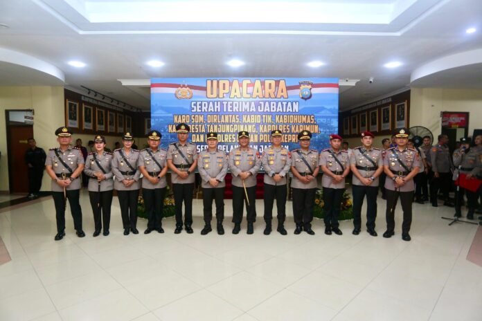 Radarnews9.com || Batam – Rabu, 7 Januari 2026. Kapolda Kepulauan Riau Irjen. Pol. Asep Safrudin, S.I.K., M.H., memimpin upacara Serah Terima Jabatan (Sertijab) sejumlah pejabat utama di lingkungan Polda Kepri, meliputi Karo SDM, Dirlantas, Kabid TIK, Kabidhumas, Kapolresta Tanjungpinang, Kapolres Karimun, dan Kapolres Bintan. Selain itu, turut dilaksanakan pelantikan jabatan Dirreskrimum dan Dirresnarkoba Polda Kepri. Kegiatan tersebut berlangsung di Lobby Utama Polda Kepri, Rabu (7/1/2026).