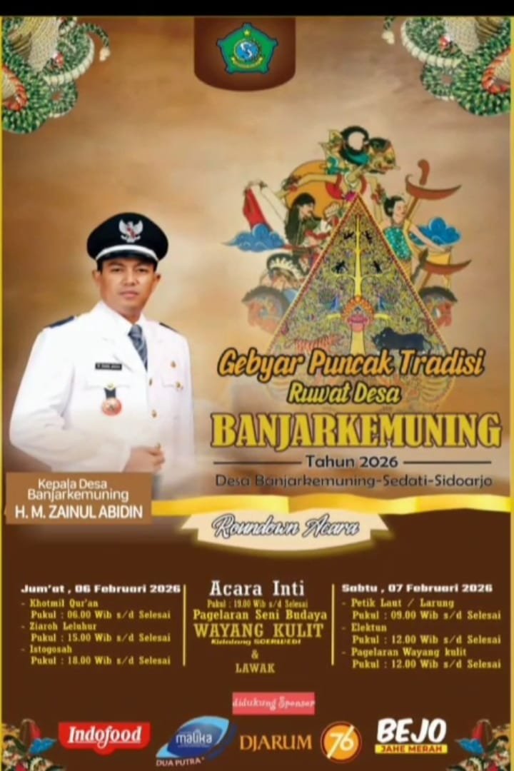 Sidoarjo – Ruwat Desa Banjar Kemuning Tahun 2026 tidak hanya menjadi momentum doa dan pelestarian tradisi, tetapi juga melahirkan karya budaya yang memperkuat identitas desa. Salah satu hal yang paling menyita perhatian dalam rangkaian kegiatan tersebut adalah hadirnya lagu “Banjar Kemuning”, sebuah lagu khusus ciptaan warga setempat, ,Ciptaan . Alwan suyuti / bang tiger yang dipersembahkan untuk Desa Banjar Kemuning, Kecamatan Sedati, Kabupaten