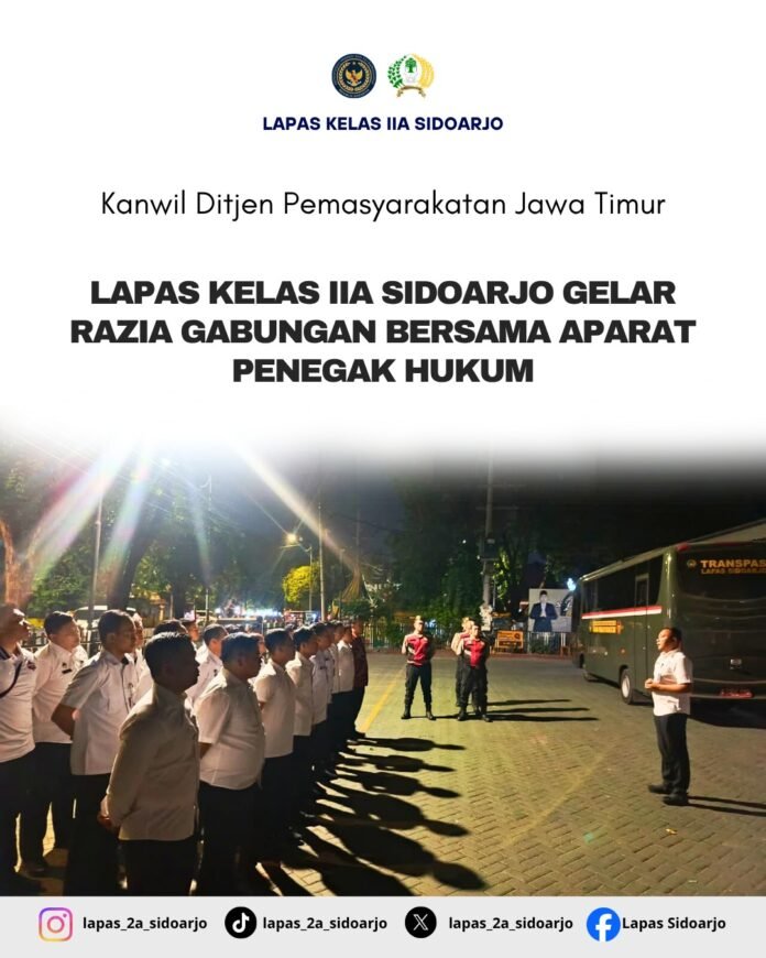 Radarnews9.com || Sidoarjo, 11 Oktober 2025 — Menindaklanjuti arahan Direktur Jenderal Pemasyarakatan tentang pelaksanaan Razia Gabungan dengan Aparat Penegak Hukum (Polres dan Brimob) setempat serta publikasi kegiatan tersebut, Lembaga Pemasyarakatan Kelas IIA Sidoarjo yang berada di bawah naungan Kantor Wilayah Kementerian Imigrasi dan Pemasyarakatan Jawa Timur, telah melaksanakan kegiatan razia pada Jumat malam, 10 Oktober 2025.