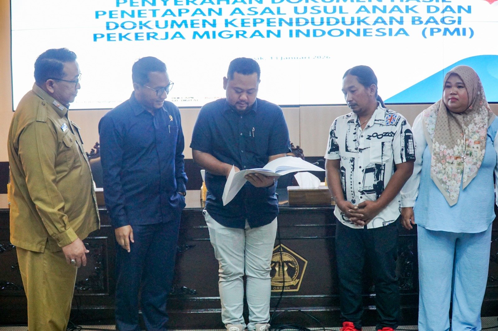 Salah satu PMI yang mendapatkan hak pembuatan dokumen akta kelahiran anak adalah, Sugi Utomo warga Desa Sekapuk, Ujungpangkah, Gresik. Didampingi istrinya Marwah menerima beberapa dokumen yang diserahkan langsung oleh Bupati Gresik di ruangan Putri Cempo, Pemkab Gresik, Selasa (13/1/2026).