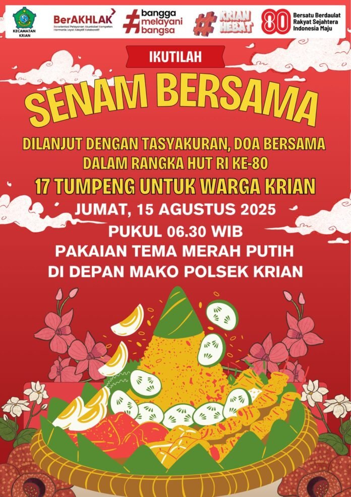 “Ayo dulur dulur warga masyarakat Kecamatan Krian, ojok lali Yo,dino Jumat tanggal 15 Agustus 2025 di mulai jam 06.00 wib pagi Yo rek , kita senam bersama Ben awet nom lur. (Ami)