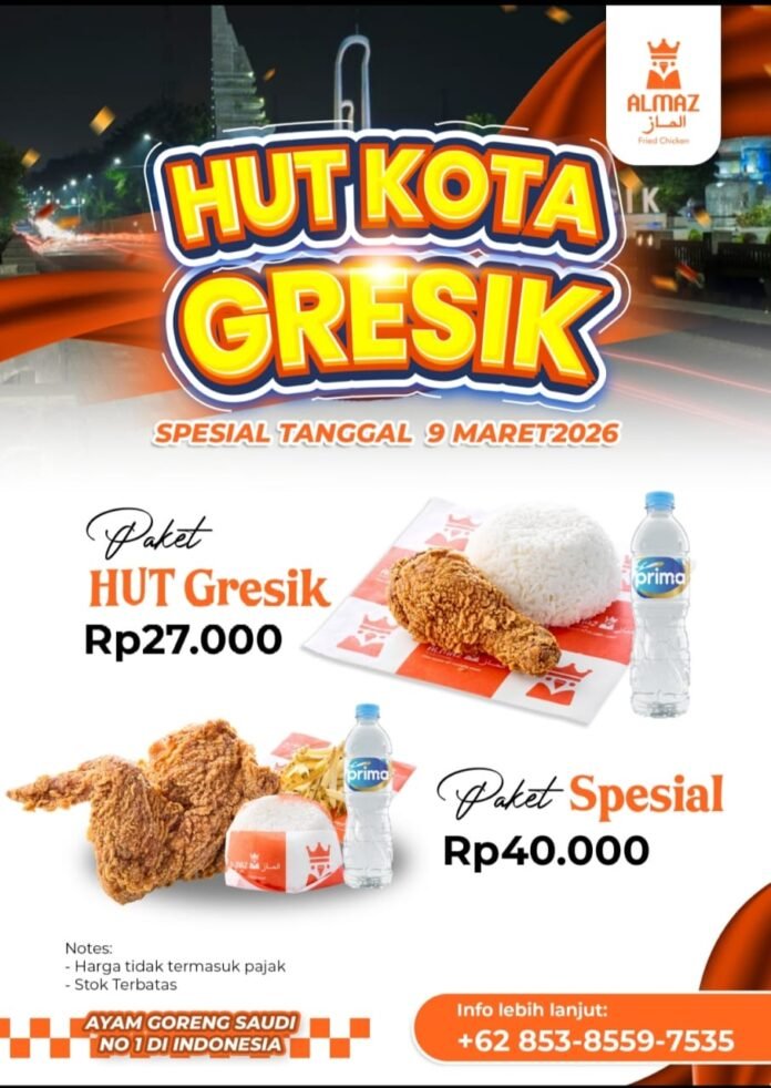 Radarnews9.com || GRESIK – Dalam rangka memperingati Hari Ulang Tahun ke-539 Gresik, Almaz Fried Chicken menghadirkan promo spesial bagi masyarakat. Program ini digelar pada 9 Maret 2026 sebagai bentuk partisipasi dalam memeriahkan hari jadi kota sekaligus mengajak warga menikmati sajian ayam goreng dengan cita rasa khas.