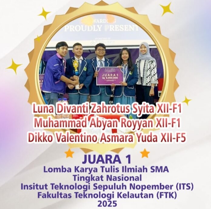 Radarnews9.com || Sidoarjo, Prestasi siswa siswi SMAN 1 Taman kec Taman kab Sidoarjo sudah tidak di ragukan lagi, prestasi yang baru baru ini di tunjukan dengan meraih gelar juara 1 lomba karya tulis ilmiah SMA tingkat Nasional 2025 yang di selenggarakan oleh Fakultas Tehnologi Kelautan ( FTK ) Institut Tehnologi Sepuluh Nopember ( ITS ) Surabaya.