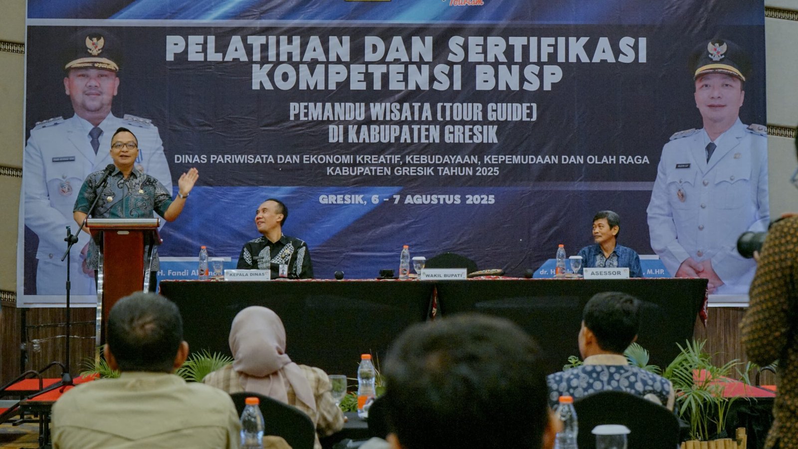 Hal ini disampaikan Wakil Bupati Gresik Asluchul Alif saat membuka pelatihan pemandu wisata (Tour Guide) yang diselenggarakan Dinas Pariwisata Ekonomi Kreatif Kebudayaan dan Olahraga (Disparekrafbudpora) yang digelar di Hotel Horison, Gresik, Kamis (7/8/2025).