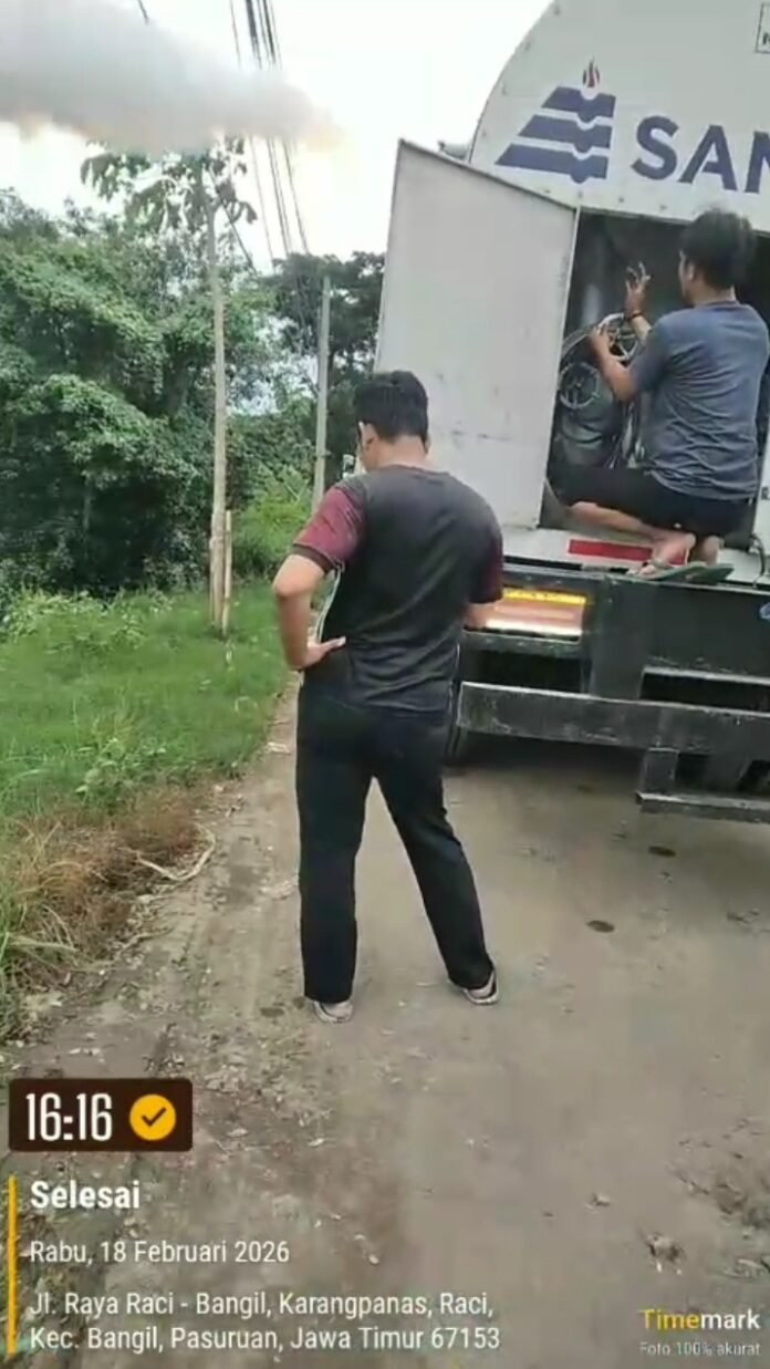 Pasuruan – Gas nitrogen dibuang di pinggir jalan raya provinsi Raci–Bangil, Kabupaten Pasuruan, memicu kekhawatiran warga sekitar dan pengguna jalan. Insiden itu terjadi pada 18 Februari 2026 sekitar pukul 16.16 WIB, tepat di jalur yang berbatasan langsung dengan area persawahan produktif di Karangpanas, Kecamatan Bangil.